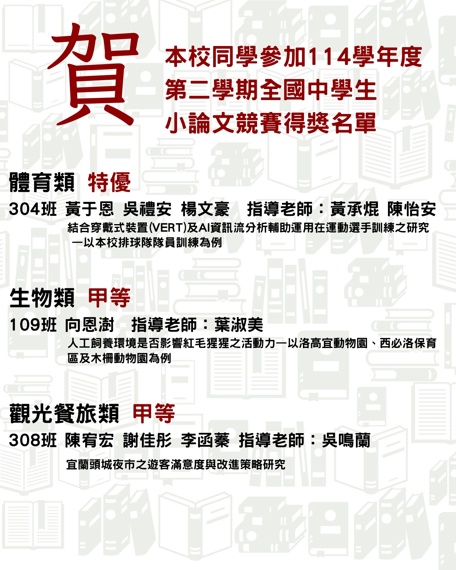 全國高級中學閱讀心得寫作比賽第1150310梯次 頭城家商得獎名單