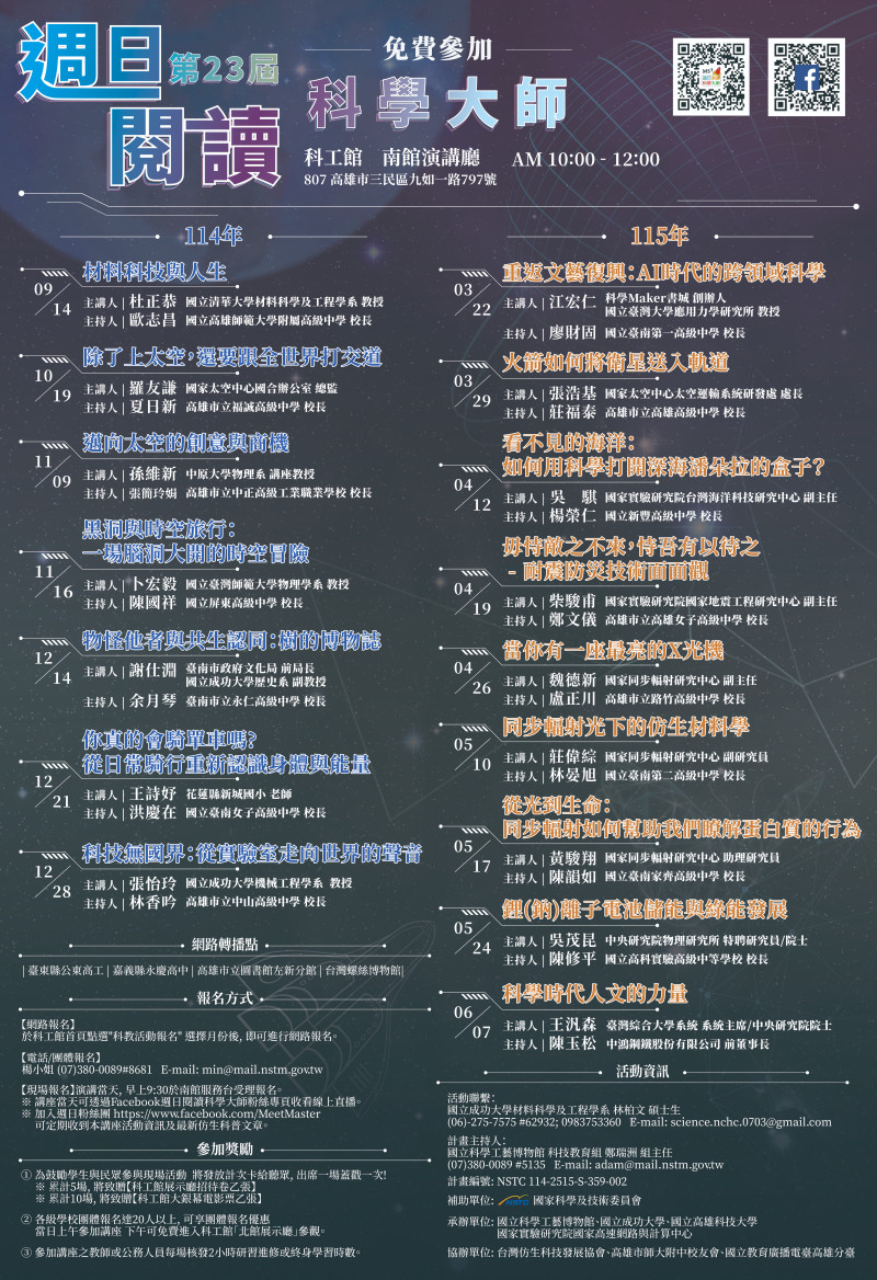 國立科學工藝博物館辦理第23屆週日閱讀科學大師」系列科普講座相關資訊,鼓勵師生踴躍報名參加。