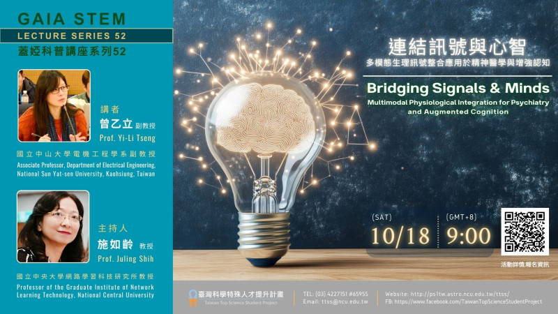國立中央大學辦理線上講座:《蓋婭科普講座系列 52》—「連結訊號與心智:多模態生理訊號整合應用於精神醫學與增強認知」,請師生踴躍報名參加。