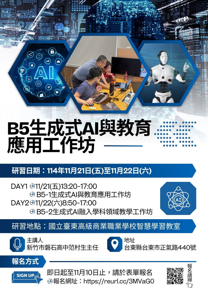 國立臺南二中承辦「B5生成式AI與教育應用工作坊-臺東場」,請踴躍參加。