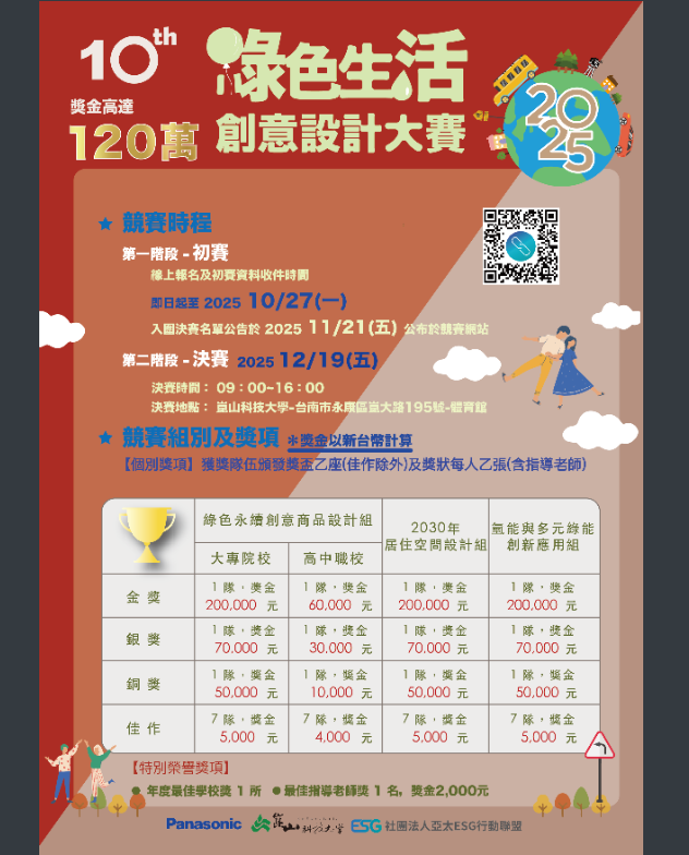一、台灣Panasonic集團自2015年每年定期舉辦「綠色生活創意設計大賽」,本校延續前九屆綠色生活創意設計大賽精神舉辦「第十屆2025 綠色生活創意設計大賽」,讓創造美好生活的核心精神從校園、城市開始深化,激發學子們對「淨零碳排與智慧低碳生活、永續能源」,共同建立永續的未來。