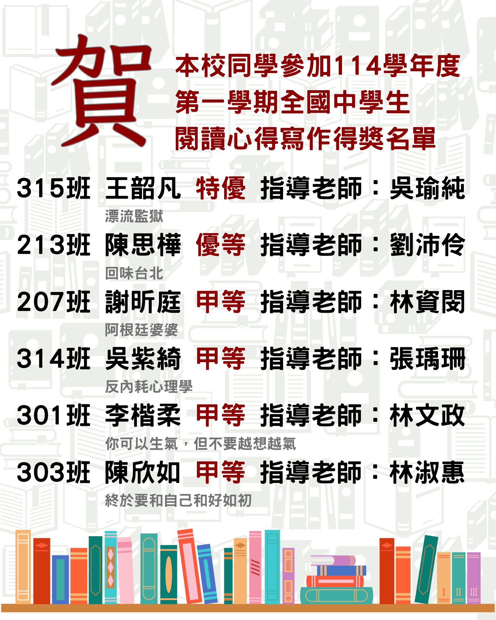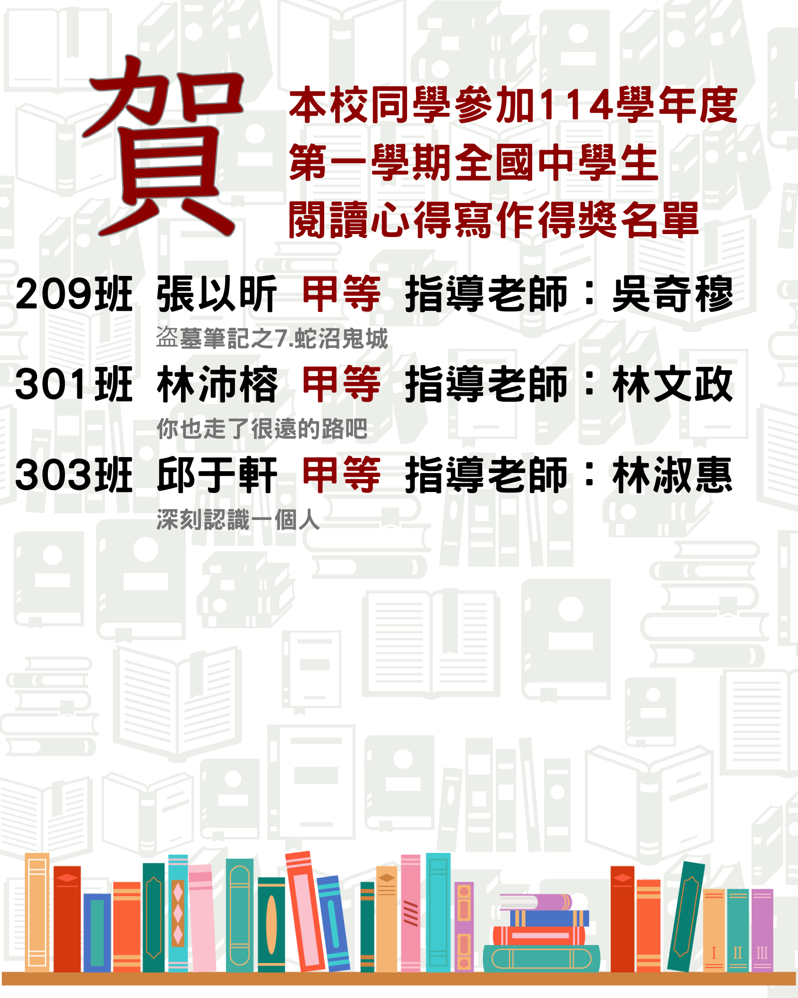 全國高級中學閱讀心得寫作比賽第1141009梯次 頭城家商得獎名單