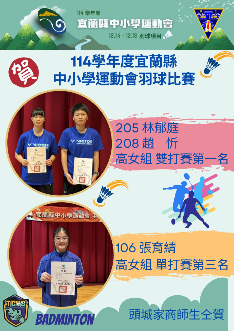 賀!本校羽球隊中小學運動奪得1金1銅!