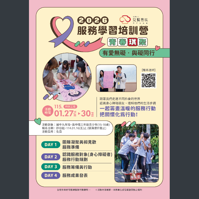 「2026青春琪聚-有愛無礙,與礙同行」寒 假服務學習培訓營簡章海報