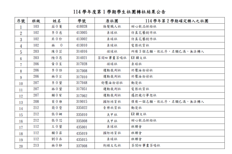 1 1 4 學年度第 1 學期學生社團申請第2學期轉社結果公告