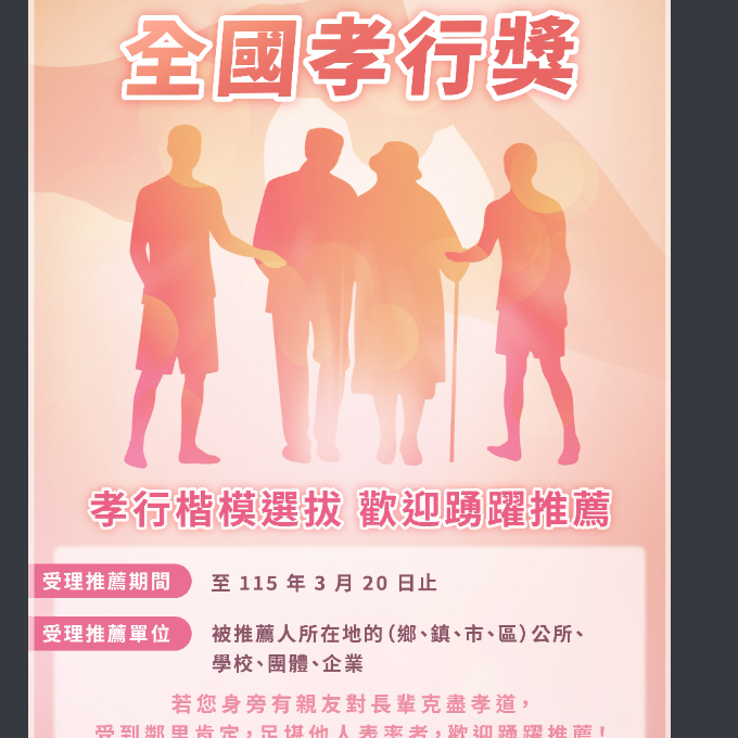 內政部「115年全國孝行獎孝行楷模選拔歡迎踴躍推薦」