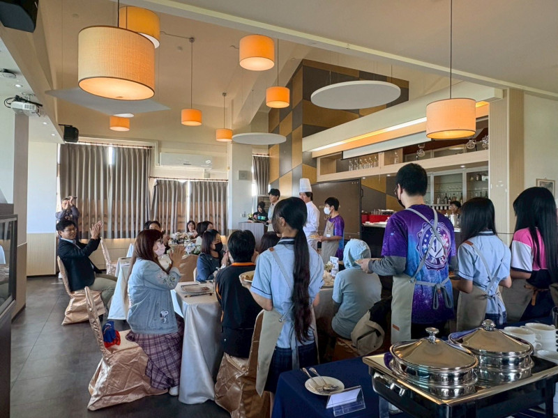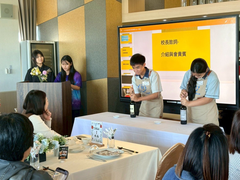 觀光科則帶領國中生,實際投入餐會擔任司儀主持、現場服務、出菜秀、紅酒開瓶表演,瞬間充滿儀式感與掌聲,