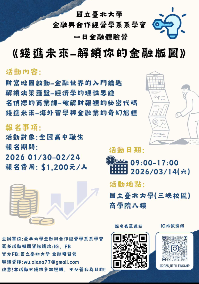 主旨:國立台北大學金融與合作經營學系系學會訂於民國115年3月14日(六)辦理「一日金融體驗營」活動,歡迎貴校學生踴躍報名參加,請查照。
