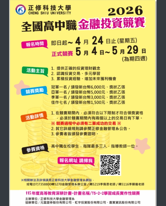 主旨:正修科大金融管理系舉辦「2026全國高中職金融投資競賽」,請貴校協助公告周知並鼓勵師生踴躍報名參賽,請查照。