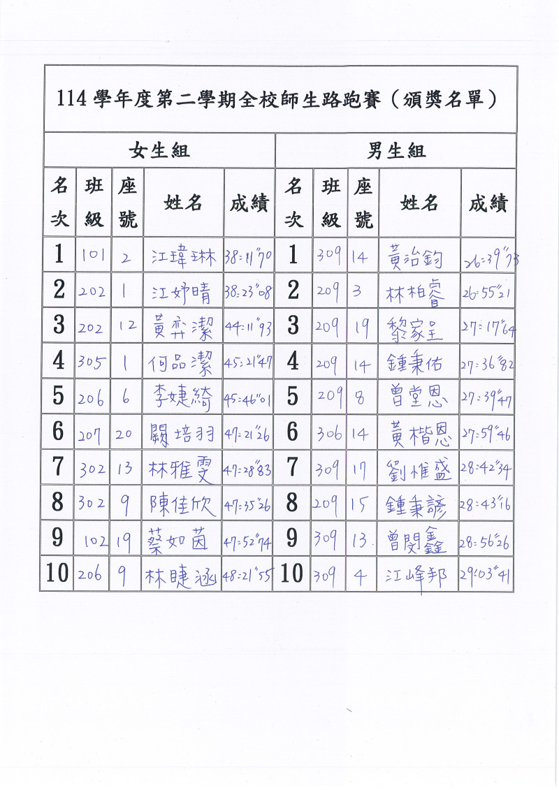 114學年度全校路跑活動成績詳如附件。
