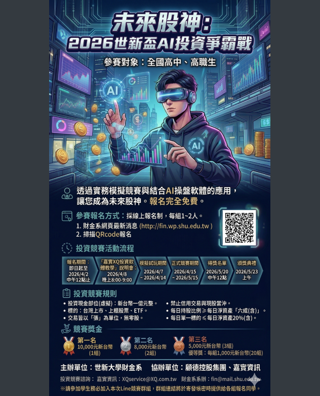 主旨:檢送本校辦理「未來股神:2026世新盃AI投資爭霸戰」競賽規則及電子海報,敬請貴校公告並鼓勵同學踴躍參加,請查照。