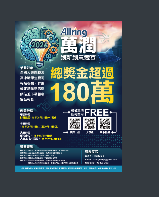 主旨:崑山科大辦理「萬潤2026創新創意競賽- (高中職組)」,請貴校協助宣傳並鼓勵所屬師生踴躍參賽,請查照。