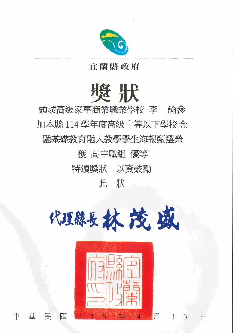宜蘭縣114學年度高級中等以下學校金融基礎教育融入教學學生海報甄選,榮獲高中職組優等
