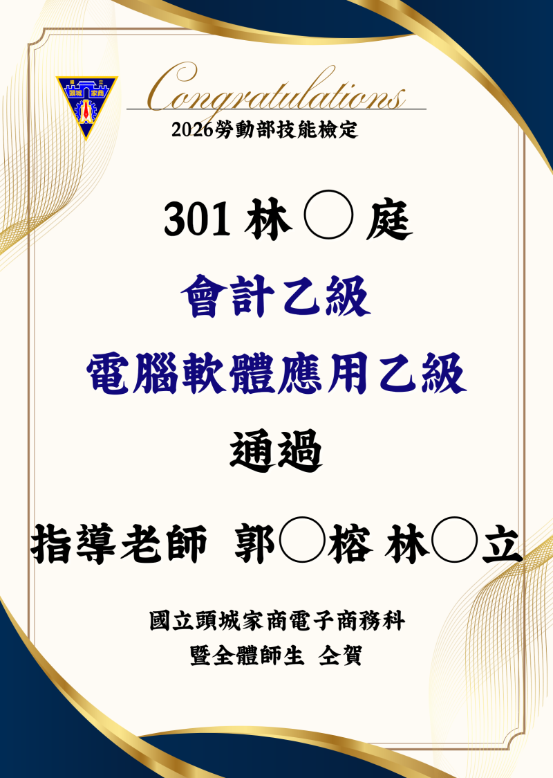 賀!301電商科學生林O庭,同時取得電腦軟體應用乙級、會計資訊乙級雙證照