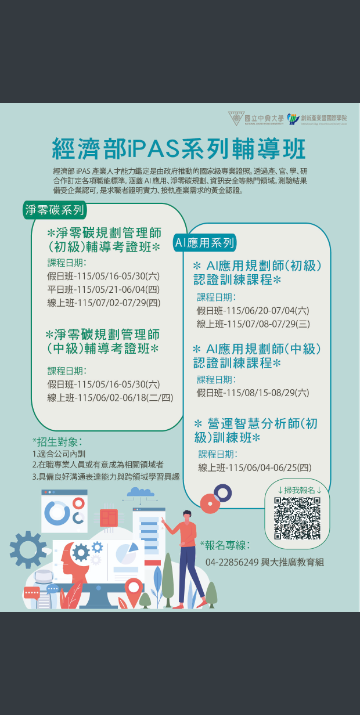 轉知國立中興大學辦理「經濟部iPAS系列輔導班(淨零碳、AI應用 及營運智慧分析等課程)」招生資訊