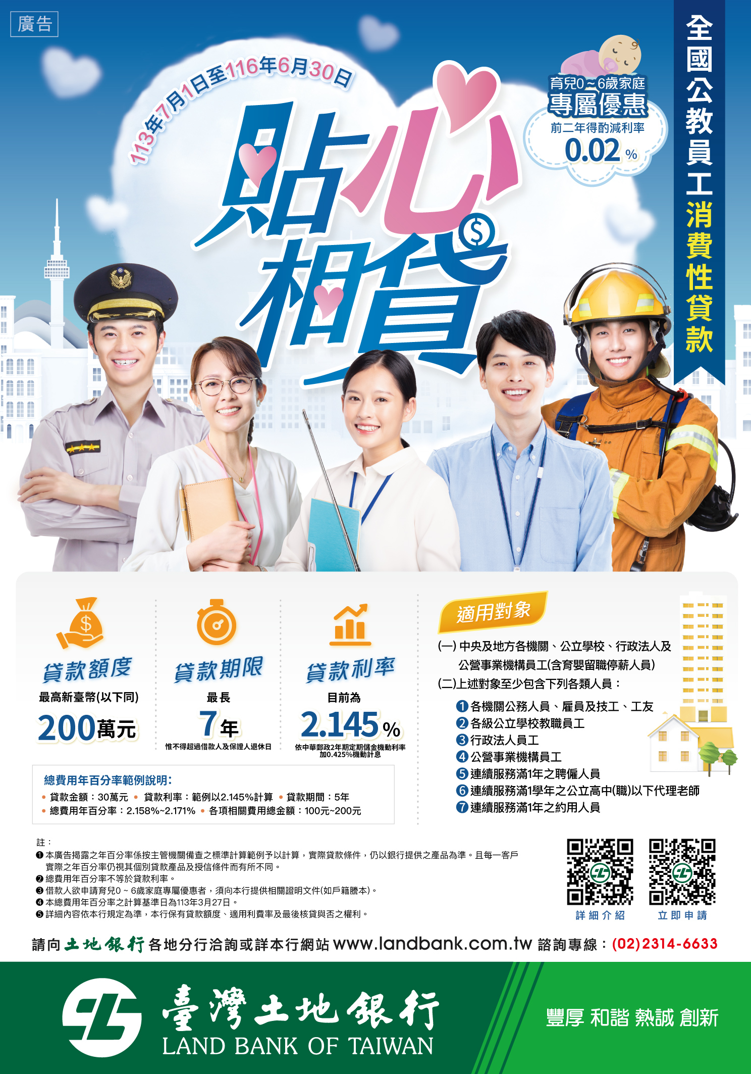 轉知:113年至116年「貼心相貸」-全國公教員工消費性貸款, 經公開徵選由臺灣土地銀行股份有限公司賡續承作。