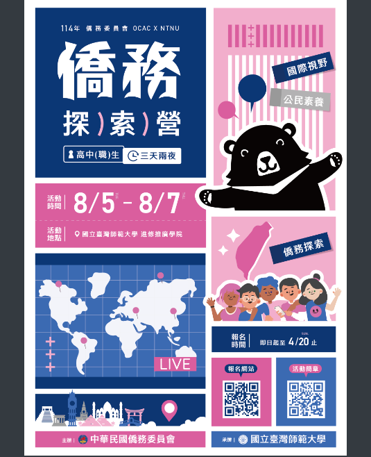 活動費用:本活動由僑務委員會全額補助,包含在營期間之三餐、住宿及旅遊平安保險,錄取學員無須額外付費;惟確認錄取後須先繳交保證金新臺幣1,000元,全程參與並繳交活動心得後,由承辦單位統一辦理全額退費。