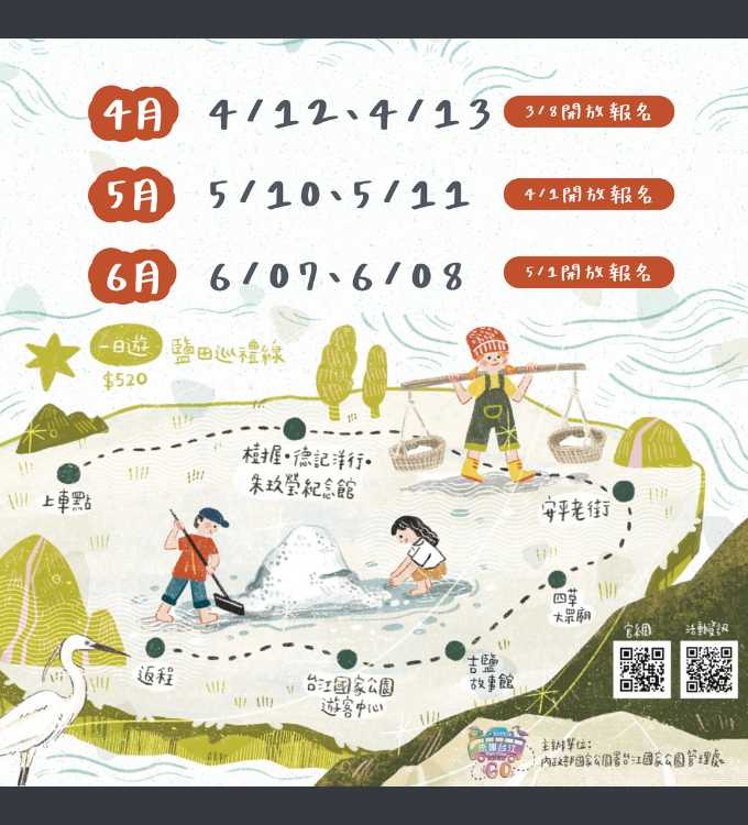 轉知內政部國家公園署台江國家公園管理處114年4至6月 解說專車行程以台江國家公園漁、鹽產業文化為主軸,適 合環境教育或親子共學活動。